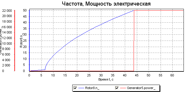 После достижения частоты вращения ротора в 50 Гц, автоматически подключается генератор, которой снимает мощность, выделяющуюся в активно элементе. Сумма моментов, действующая на ротор, становится равной 0, и частота вращения ротора стабилизируется. Изменение частоты ротора и электрической мощности генератора изображено на следующем рисунке (см. Рис. 2).