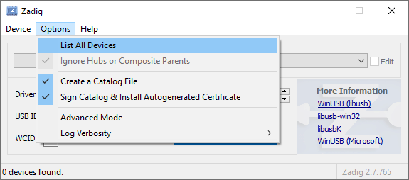 - В окне приложения "Zadig" нажать на кнопку "Options" и в открывшемся