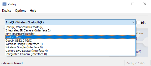 - Установить утилиту "Zadig" (https://zadig.akeo.ie/), которая позволит установить драйвер к устройству HackRF One.