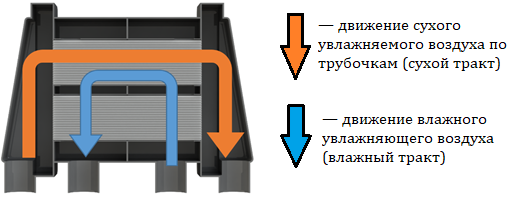 На рисунке (Рис. 1) рыжим цветом обозначено направление движения сухого атмосферного воздуха (сухой тракт увлажнителя), который втекает в цилиндрические трубочки, образующие секции (изображены серым цветом). На рисунке (Рис. 1) количество секций трубочек равно двум.
