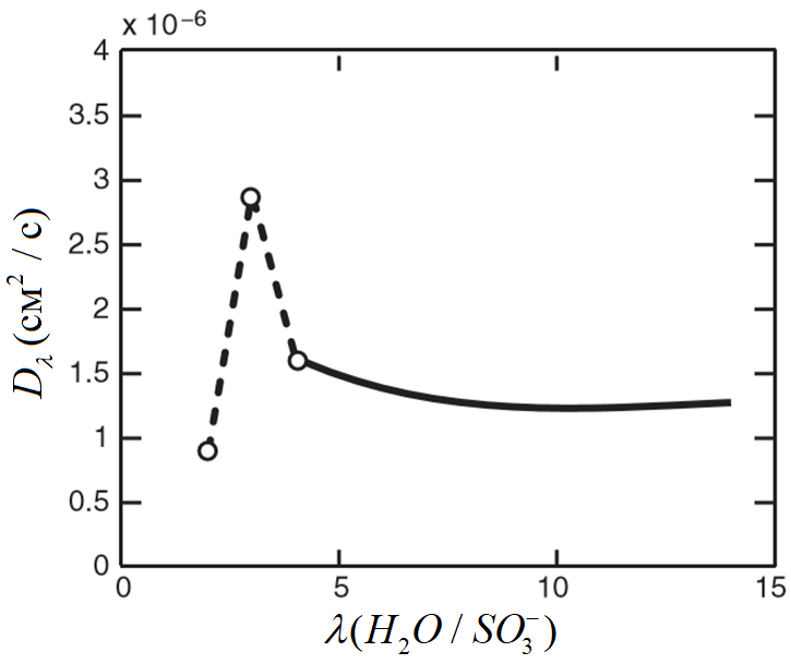 Главным образом транспортные процессы водяного пара через материал трубочек (нафион) определяются коэффициентом диффузии Dλ (м2/с). Он определяется по графику на рисунке (Рис. 2) [2, с. 239]