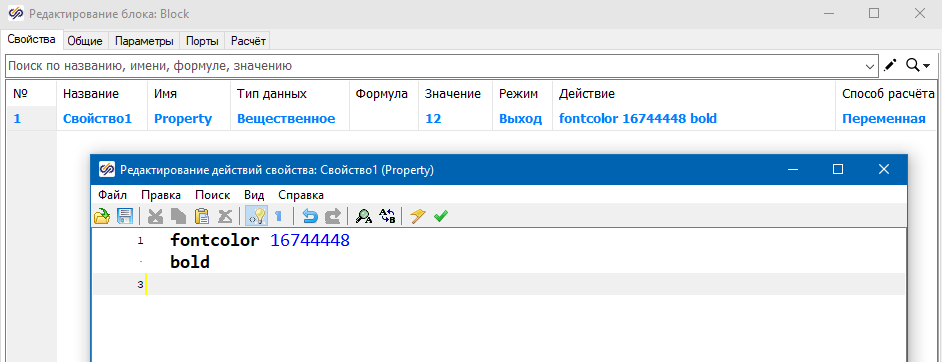 Для задания жирного типа шрифта, можно использовать ключевое слово bold, указав его после кода цвета. Например, для установки сине-голубого жирного шрифта текста свойства надо задать в поле "Действие":