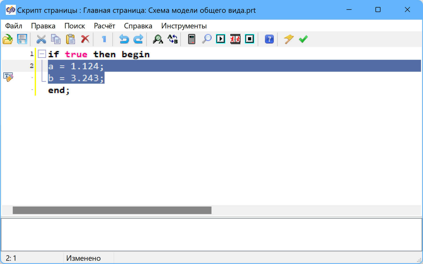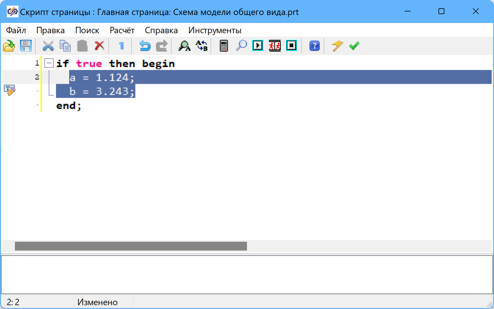 Редактор языка программирования SimInTech поддерживает групповой ввод и удаление отступов для оформления программного кода.