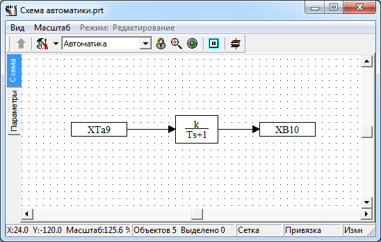В качестве примера удалим значение параметра "Коэффициент усиления" инерционно-дифференцирующего звена с именем DifAperiodika1. На рисунке (Рис. 9) приведено рабочее окно проекта с расчетной схемой, на которой присутствует указанный блок.
