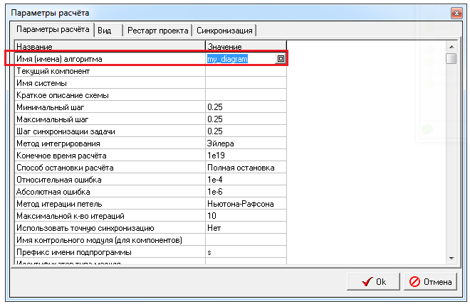 вводят значение контрольного параметра "Имя (имена) алгоритма", показано на рисунке (Рис. 7), имя my_diagram.