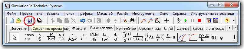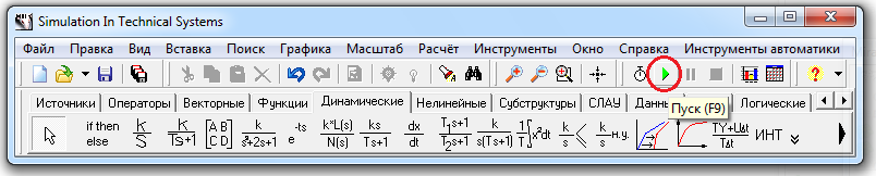Рис. 8. Кнопка запуска расчета В SimInTech разработана система семантического контроля наличия ошибок, которая в строке сообщений рабочего окна проекта указывает на недостатки при определении свойств блоков, соединении блоков между собой и многие другие.