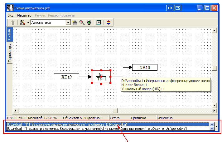 "(1): Выражение задано не полностью" в объекте DifAperiodika1"Параметр элемента: Коэффициенты усиления(k) не может быть вычислен" в объекте DifAperiodika1При двойном нажатии левой клавишей "мыши" на имя элемента в строке сообщений в рабочем окне проекта будет подсвечен блок с ошибкой.
