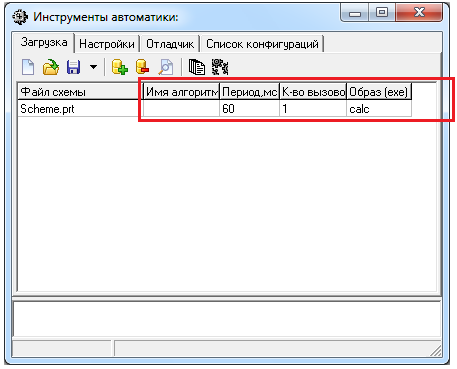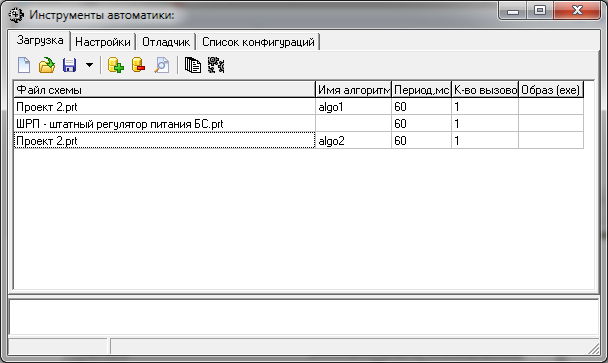 Исполняемая среда для приборов позволяет загружать в один прибор одновременно несколько различных расчётных модулей и выполнять их с разным тактом. При этом возможна загрузка одного и того же расчётного модуля, сгенерированного по единой схеме несколько раз с разным уникальным именем, при этом каждый из экземпляров расчётного модуля может быть подключен к разным сигналам. Каждой строке в таблице "Загрузки" соответствует вызов расчётного модуля, который сгенерировался по соответствующей схеме указанной в поле "Файл схемы". Имя исполняемого файла расчётного модуля, соответствующего данной схеме указывается в самом файле схемы (Параметры расчёта – Имя алгоритма). Следует различать в данном случае имя алгоритма, заданное внутри схемы и поле "Имя алгоритма", заданное в таблице "Загрузки". По первому определяется имя файла расчётного модуля, а по второму – уникальное имя, по которому данный исполняемый файл загружается в исполняемой среде прибора. При этом если в поле "Имя алгоритма" в таблице "Загрузки" ничего не задано, то среда разработки в файл конфигурации загрузки в качестве имени алгоритма принимает имя исполняемого файла. Если же данное поле задано, то имя алгоритма не совпадает с именем исполняемого файла. Например, на рисунке (Рис. 4) изображено, что расчётный модуль, сгенерированный по файлу схемы "Проект 2.prt" будет загружен 2 раза, но под разными именами алгоритмов (algo1 и algo2), а расчётный модуль, сгенерированный по файлу "ШРП - штатный регулятор питания БС.prt", будет загружен один раз под именем алгоритма, соответствующем имени исполняемого файла, заданному в настройках проекта. При этом, для того чтобы загрузить один и тот же расчётный модуль под разными именами алгоритмов и привязать их к разным сигналам, необходимо задать имена сигналов в блоках типа Входной контакт и Выходной контакт в схеме соответствующего алгоритма с применением специального выражения