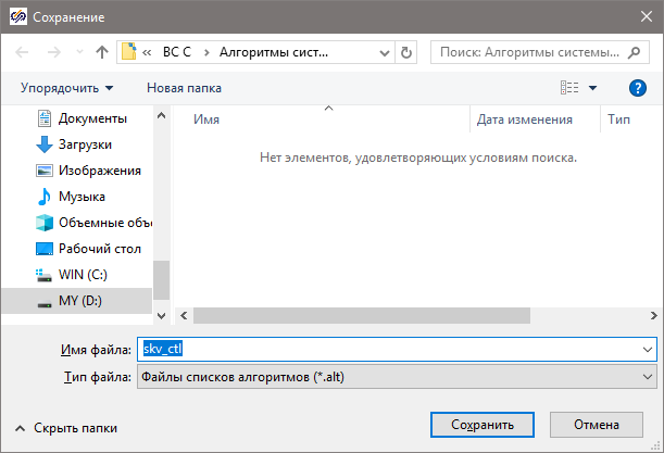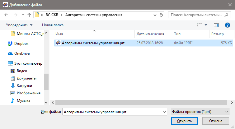 В появившемся окне добавления проекта выберите проект "Алгоритм системы управления.prt"