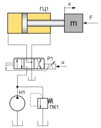 В нашем распоряжении имеется гидроцилиндр ГЦ1 с диаметром поршня 50 мм и диаметром штока 25 мм, который перемещает груз массой 500 кг и преодолевает силу F. Гидроцилиндр управляется распределителем Р1 с электрическим управлением. Центральная секция распределителя выполнена таким образом, что обе полости в нейтральном положении распределителя соединены со сливом. Площадь проходного сечения распределителя в полностью открытом положении — 7 мм2. В качестве источника энергии используется нерегулируемый объемный насос Н1 постоянной подачи 30 л/мин с переливным клапаном ПК1, настроенным на давление открытия 200 бар. Максимальное давление (при максимальном расходе через клапан) — 205 бар.