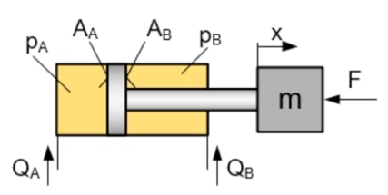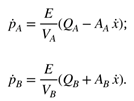 Обратите внимание, что геометрический расход в уравнении для полости А поставлен со знаком "минус", а в уравнении для полости B со знаком "плюс". Это связано с тем, что в случае отсутствия иных расходов, положительная скорость перемещения поршня будет вызывать уменьшение давления в полости A и увеличение давления в полости B. Напоминаю, что большинство ошибок в математических моделях связано именно с неправильной расстановкой знаков расходов!