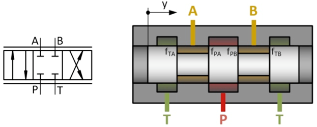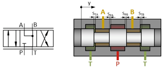 В корпус с расточками вставлен цилиндрический золотник с тремя буртиками. В центральную проточку подается давление питания, а крайние соединены со сливом. Полости между буртиками золотника могут быть соединены с соответствующими полостями гидроцилиндра.