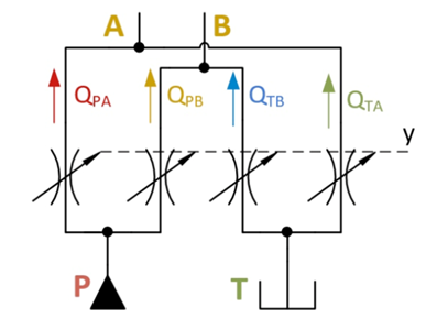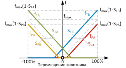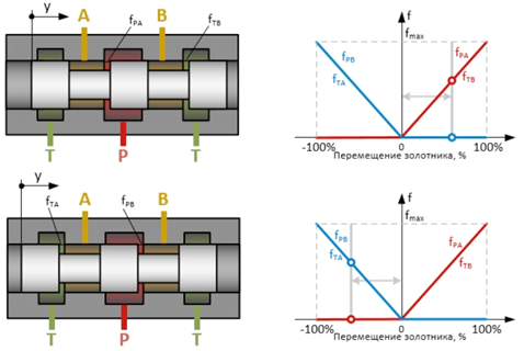 Видно, что при нулевом положении площади сливных кромок ТА и ТВ не равны нулю. При этом, напорные кромки открываются при ненулевом смещении золотника. Т. к. в нашем простейшем примере в корпусе одинаковые проточки, линии изменения площадей будут проходить с одинаковым наклоном.