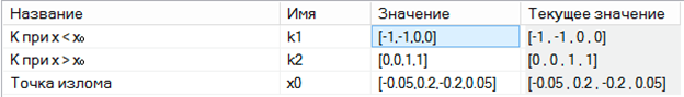 Для моделирования сечения мы будем использовать блок Излом из закладки "Нелинейные". Чтобы не плодить кучу блоков, мы все 4 площади построим с использованием одного блока. Для этого воспользуемся тем, что практически все блоки в SimInTech являются векторными. Мы в свойствах блока вместо одного значения укажем вектор из 4 значений, соответствующих графику на рисунке выше.