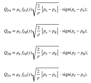 Ещё раз обращаю внимание, что раз уж мы направили все расходы в одном направлении, считать их нужно соответствующим образом. В последних двух уравнениях при вычислении перепада давлений мы вычитаем из давления слива давление в соответствующей полости. Знак расхода при этом определяется функцией sign. Таким образом, при нулевом давлении слива эти расходы практически никогда не будут положительными, но тем не менее мы направляем их именно так, чтобы при анализе не было путаницы. Теперь мы всегда будем знать, что если расход положителен, он направлен от источника питания к потребителю, если отрицателен — наоборот. Очень удобно!