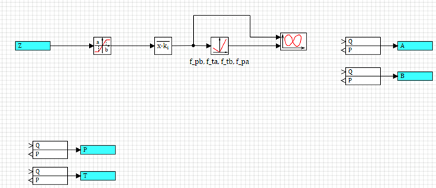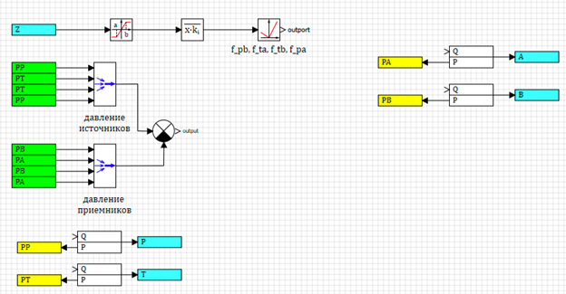 Чтобы не рисовать множество линий мы воспользуемся блоками В память и Из памяти. Полученные давления мы запишем в переменные PA, PB, PT, PP блоки В память (см. Рис. 10).
