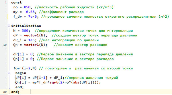 Хотя мы и будем использовать блок-схему для расчета расходов, без языка программирования нам все равно не обойтись. В скрипте блока "Распределитель" мы подготовим константы и рассчитаем значения для интерполяции расходов.