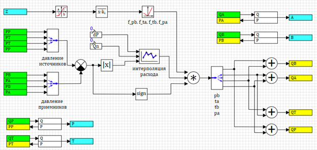 На выходе из блока излом у нас вектор из 4 площадей. Для расчета нам нужно подготовить вектора из давлений источников и давлений приемников, что бы мы могли сформировать разницу давления для расчета по формулам *.