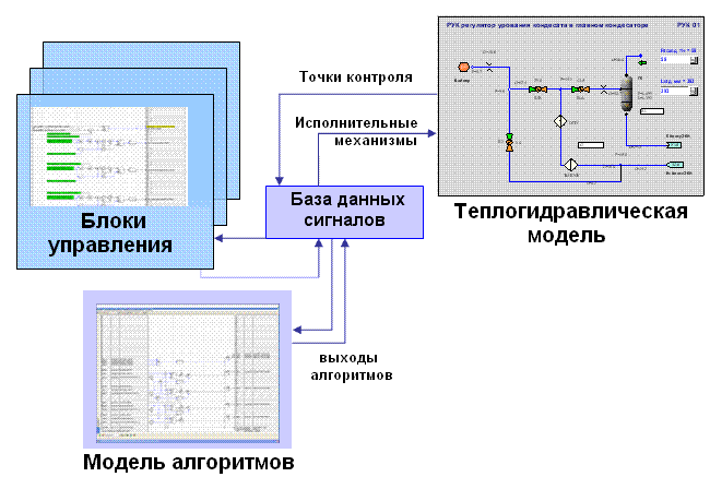Модель алгоритмов представляет собой описание работы системы управления в виде структурных схем (диаграмм алгоритмов) в различных режимах. Модель алгоритмов получает из базы данных сигналы о состоянии оборудования, параметрах системы, командах оператора, а также командах, сформированных другими алгоритмами. На основании заложенной в алгоритм логики вырабатываются сигналы ("открыть", "закрыть", "включить", "выключить" и т.п.) для блоков управления оборудованием и (или) других алгоритмов, содержащихся в базе данных.