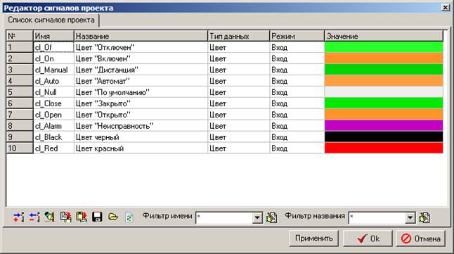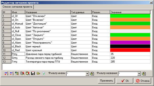 В появившемся окне вы увидите десять сигналов (констант типа Цвет), заданных по умолчанию и использующихся в скриптах многих стандартных блоков библиотеки ТРР (см. Рис. 13). Нам необходимо задать еще три новых сигнала – давление, расход и температуру пара, поступающего на турбину: "Pпту", "Gпту" и "Tпту". Задайте их значения в соответствии с рисунком (см. Рис. 14):