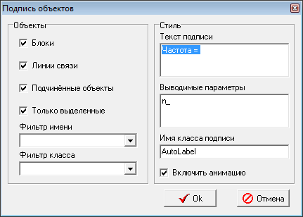 Нажмите левой кнопкой мыши на роторе и в появившемся всплывающем окне выберите пункт "Параметры объекта"*. Появится маленькое окошко, в котором надо выбрать строку с параметром n_ (Частота вращения) и нажать на кнопку Создать подписи (с буквой А, см. Рис. 27).