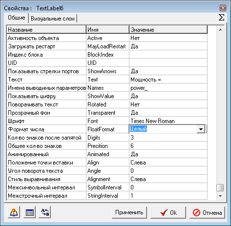 В результате мы получим новую подпись на схеме, в которой будет отображаться текущая частота вращения элемента "Ротор". Проделайте аналогичные манипуляции и выведите на схему мощность электрогенератора. Зайдите в свойства подписи мощности электрогенератора и измените формат выводимого числа на "Целый", чтобы избежать появления экспоненты в выводимой на схему мощности, см. Рис. 29. Запустите схему на расчет, убедитесь в работоспособности вновь созданных подписей.