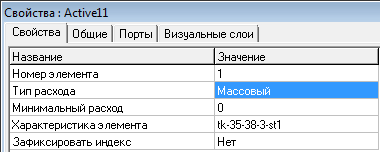 Задайте для каждого активного элемента (в свойствах) тип расхода "Массовый", а характеристику элемента – "tk-35-38-3-st1", "tk-35-38-3-st2", "tk-35-38-3-st3", "tk-35-38-3-st4" соответственно для 1, 2, 3 и 4 элемента, см. Рис. 32. Подробнее о характеристике активного элемента см. в документации к коду ТРР. Вообще говоря, характеристика – это 3 таблицы, в которой по точкам задается гидравлическое сопротивление канала, КПД элемента и момент сопротивления в зависимости от расхода (массового в нашем случае) и частоты вращения вала. В наших файлах для учебного примера задано постоянное КПД (равное 90% или 0.9) для всех частот вращения и расходов.