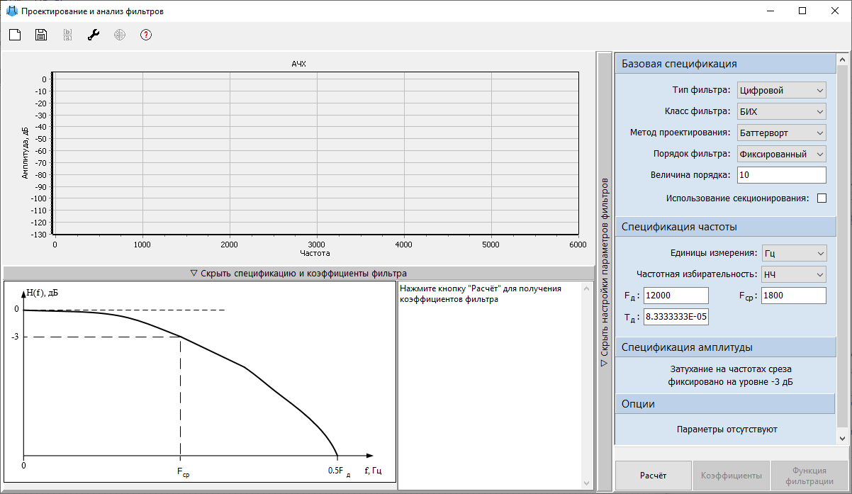 "Расчёт", предназначенная для расчета коэффициентов проектируемого фильтра и