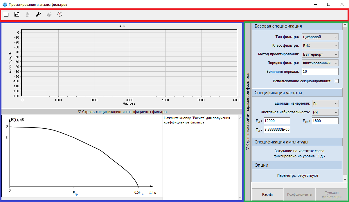 Ключевые элементы главного окна инструмента для проектирования и анализа фильтров выделены