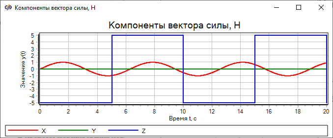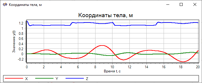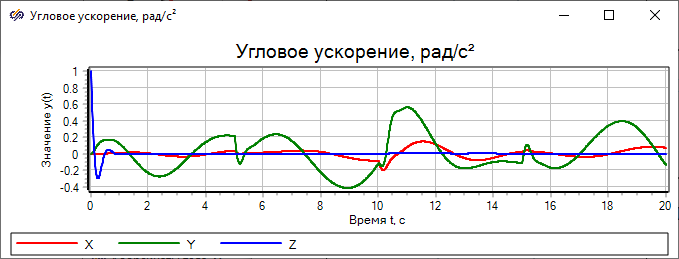 С помощью блоков Заделка, Шестиподвижная КП и Масс-инерционные характеристики" сформирована модель твердого тела, свободно двигающегося в пространстве. Блок Пространственный вязко-упругий элемент реализует модель пружины, учитывающей поперечную деформацию и изгиб. Блок Преобразование координат указывает точку крепления пружины к твердому телу. Для уменьшения количества линий связи на схеме кинематическая пара и пружина подключены к заделке с помощью блоков Ссылка на заделку. Блоки Внешняя сила и Внешний момент позволяют задать действие внешней силы и внешнего момента на твердое тело. Блоки Датчик движения" и Датчик ускорения позволяют считать геометрическое положение и угловое ускорение твердого тела. На графиках отображаются компоненты вектора внешней силы, координаты и вектор углового ускорения твердого тела.
