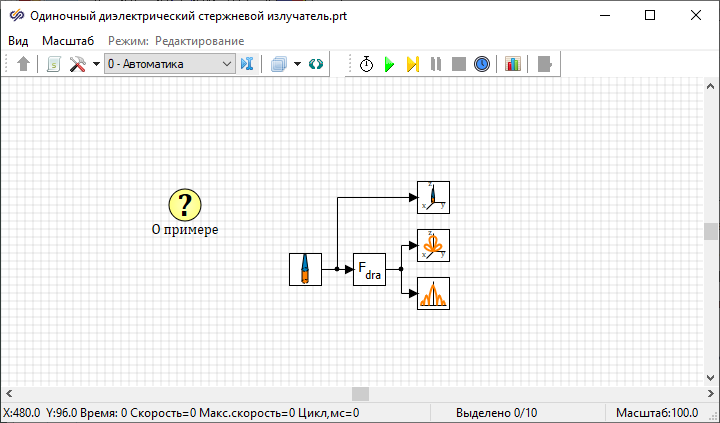 Таким образом, данный пример даёт исходное понимание функционирования блока Диэлектрическая стержневая антенна совместно с логически связанными с ним блоками библиотеки Антенны.