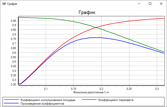 На рисунке (Рисунок 2) показан критерий определения оптимального фокусного расстояния при фиксированном угле раскрыва большого зеркала (выбирается по максимуму произведения коэффициентов КИП и коэффициента перехвата). Рисунок (Рисунок 3) показывает снижение коэффициенту усиления. численно равного произведению КНД на коэффициент перехвата, который в свою очередь, по физическому смыслу, является коэффициентом полезного действия зеркальной антенны.
