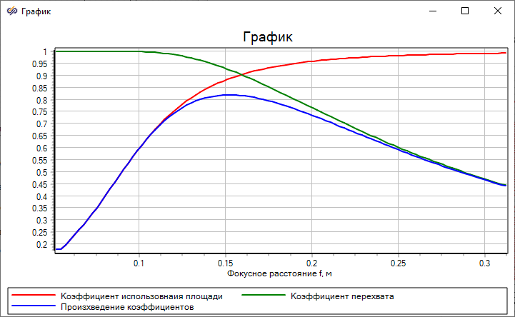 На рисунке (Рисунок 2) показан критерий определения оптимального фокусного расстояния при фиксированном угле раскрыва рефлектора (выбирается по максимуму произведения коэффициентов КИП и коэффициента перехвата). Рисунок (Рисунок 3) показывает снижение коэффициента усиления, численно равного произведению КНД на коэффициент перехвата, который в свою очередь, по физическому смыслу, является коэффициентом полезного действия зеркальной антенны.