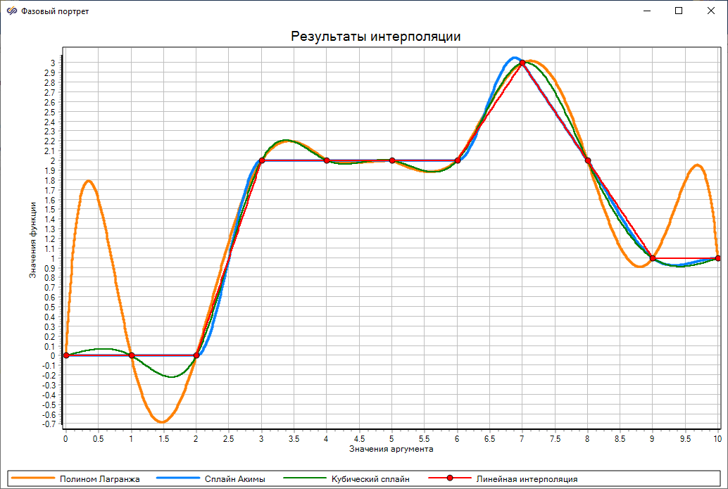 На графике отображаются результаты интерполяции различными методами. Кружки на графике линейной интерполяции отражают точки исходной табличной кривой. (Рисунок2).