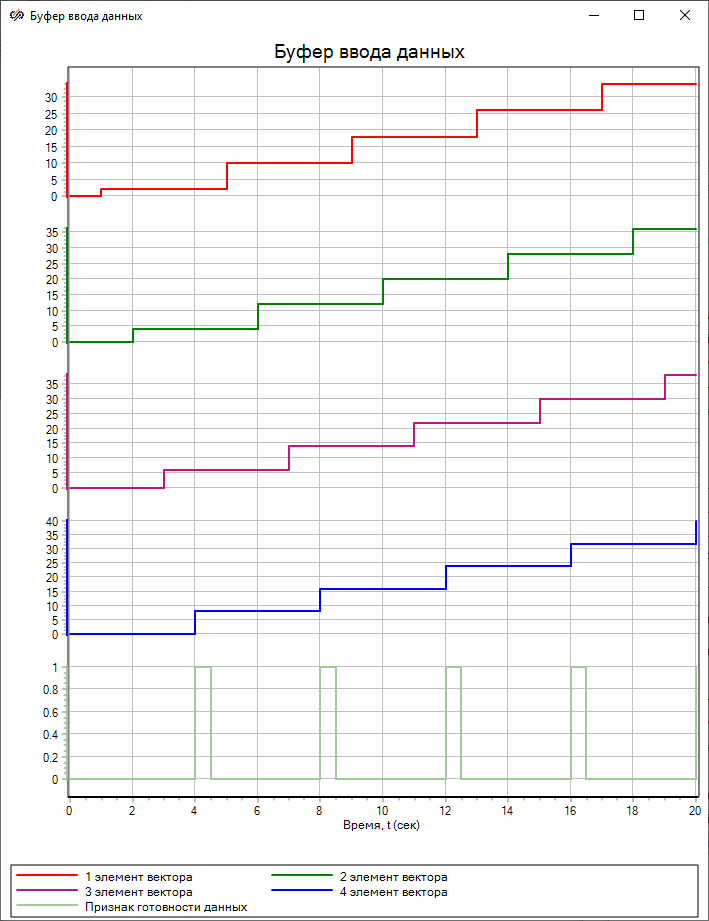 Каждую секунду модельного времени блок "Буфер последовательного ввода данных" считывает значение входного сигнал и последовательно записывает его в выходной вектор данных, начиная с первого элемента. Таким образом, на выходе блока формируется вектор размерностью "4". Блок "Буфер последовательного вывода данных" считывает данный вектор и последовательно выводит его значения.