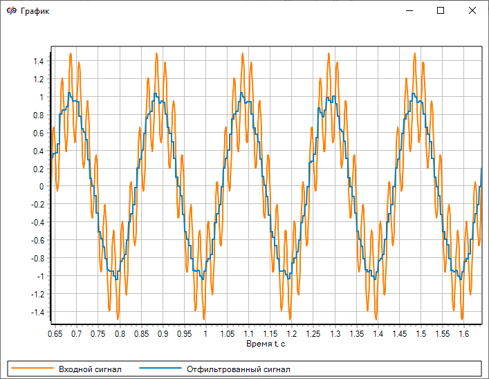 В процессе фильтрации из-за буферизации в сигнал вносится задержка величиной 0.64 с. Для наглядности сравнения входного и выходного сигналов во входной сигнал вносится задержка при помощи блока "FIFO/LIFOбуфер".