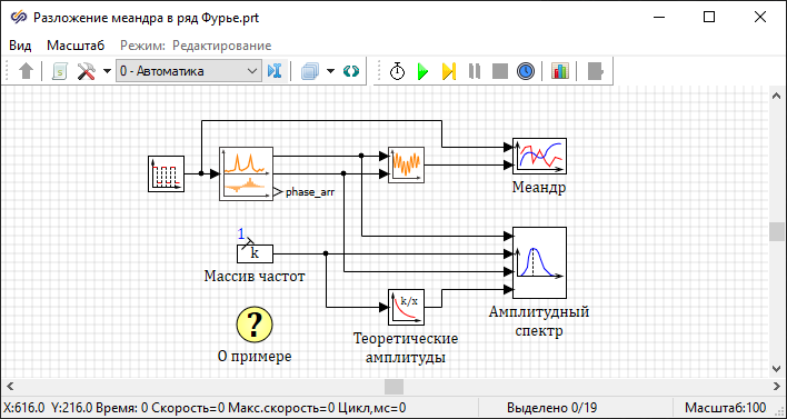Блок Константа формирует значения частот нечетных гармоник в Гц, а блок Гиперболическая функция определяет теоретические значения амплитуд гармоник в соответствии с результатами аналитического разложения меандра в ряд Фурье: