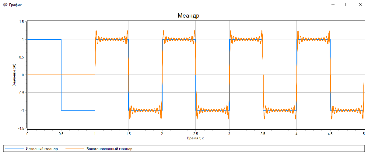 Пример разложения меандра в ряд Фурье с последующим восстановлением сигнала