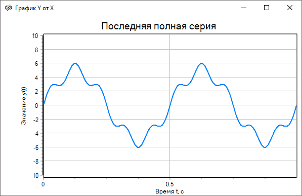 В блоке Субмодель реализуется алгоритм, необходимый для наглядности отображения последней серии значений сигнала, учтенной при спектральном анализе. Значения сигнала, учитываемые при определении спектра без усреднения, отображаются на графике с подписью "Последняя полная серия" (Рис. 3).