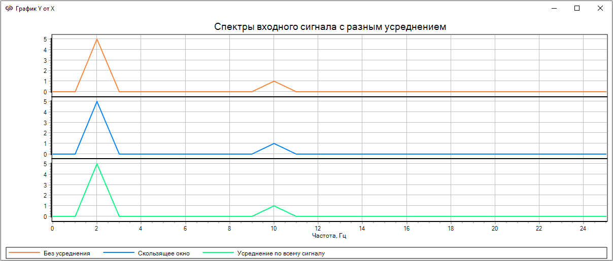 При усреднении по всему сигналу результаты расчета обновляются в моменты окончания анализа очередной серии (в данном случае каждую секунду), а значение амплитуды гармоники с частотой 20 Гц равно 1, поскольку гармоника с амплитудой 2.5 присутствует в сигнале в среднем 2/5 от его длительности: 2.5*2/5 = 1. В спектре не возникает искажений благодаря тому, что длительность анализируемой серии сигнала кратна периоду включения и отключения гармоники, и моменты включения/отключения гармоники с частотой 20 Гц попадают точно на окончание одной серии и начало другой серии.