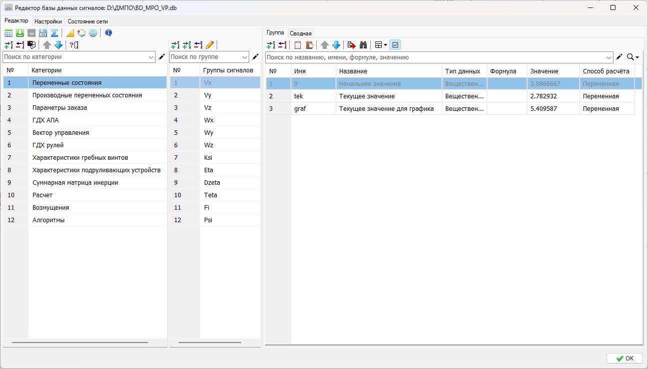 Значения сигналов групп "kgr" и "ngr" заполняются автоматически при инициализации моделирования. Запись в данные группы осуществляется с помощью скрипта главного окна модели.