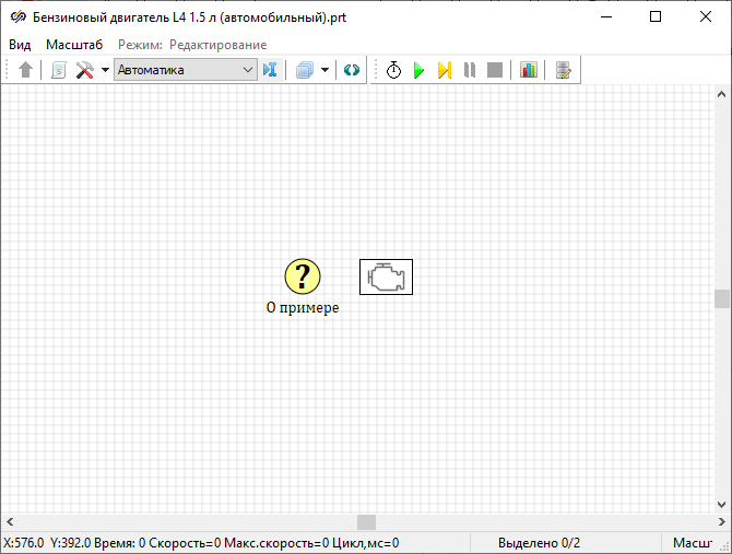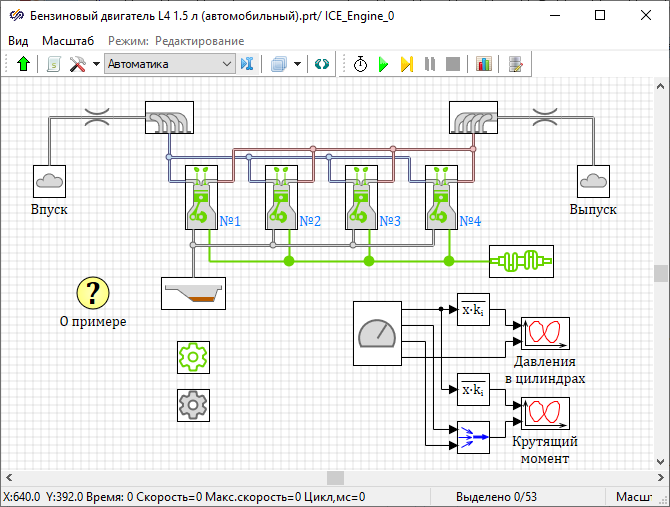 Данный проект демонстрирует применение блоков библиотеки Двигатели внутреннего сгорания для моделирования бензинового четырехтактного четырехцилиндрового рядного двигателя объемом 1.5 л, схожего с двигателями легковых автомобилей.