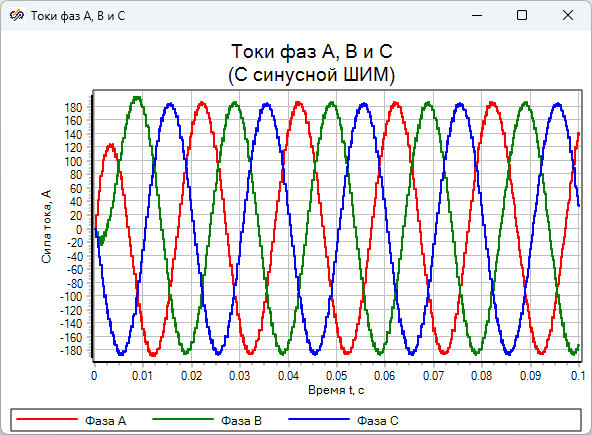 Рис. 2. График изменения токов фаз А, В и С с синусной ШИМ
