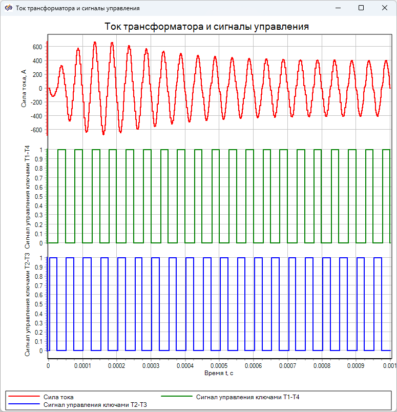 На графике "Ток трансформатора и сигналы управления" показаны графики изменения тока