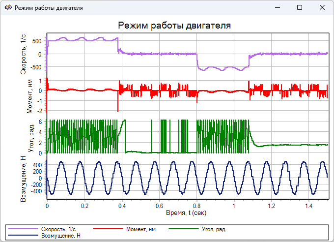 На графике "Режим работы двигателя" показано изменение скорости, момента, угла и