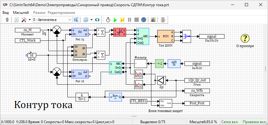 В данном примере демонстрируются возможности библиотек Электроприводы, ЭЦ - Динамика и Механика по моделированию синхронного привода. С помощью пакета проектов моделируется контур тока, контур скорости и аналоговая часть электропривода.