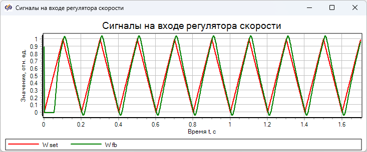 На графике "Сигналы на входе регулятора скорости" показаны сигналы регулятора