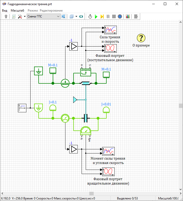 Данный проект демонстрирует возможности библиотеки "Гидросистемы" совместно с библиотекой "Механика" для моделирования гидродинамического трения.