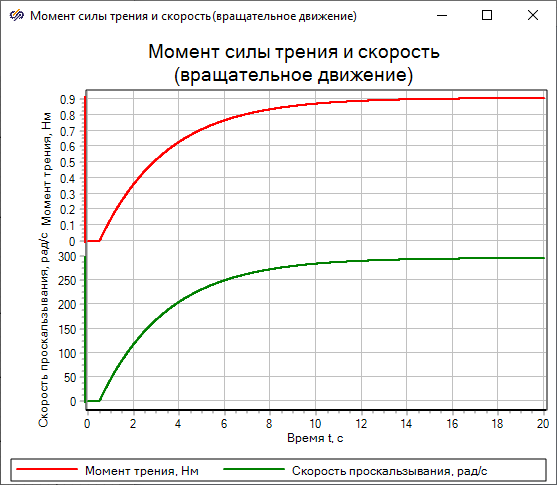 К механическому порту "R" блока "Гидродинамическое трение (вращательное движение)" подключен источник крутящего момента, равный 10 Н*м, действующий в момент времени 0,5 с. За счет момента вязкого трения происходит вращение инерции, подключенной к порту "С" блока "Гидродинамическое трение (вращательное движение)".