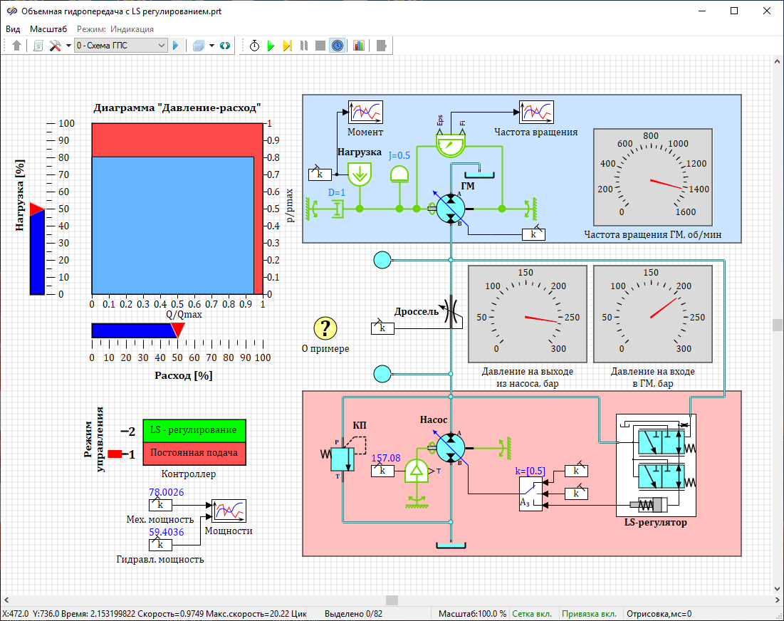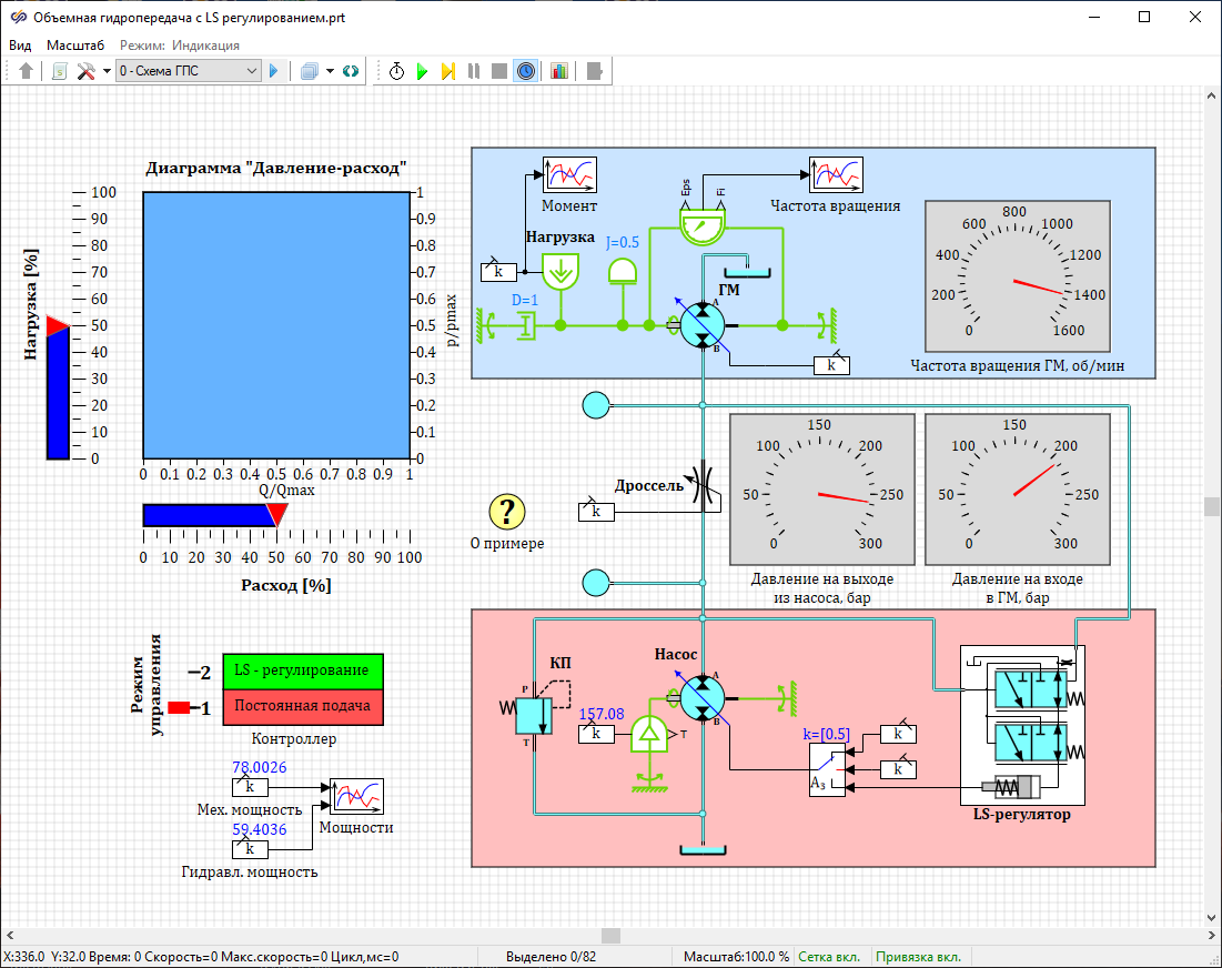 С помощью ползунка "Расход [%]" задается относительная величина расхода посредством изменения проходного сечения дросселя, установленного в напорной гидролинии (максимальная величина расхода в системе равна теоретической подаче насоса). С помощью ползунка "Нагрузка [%]" задается относительный момент сопротивления, действующий на вал ГМ (максимальный крутящий момент составляет 500 Н*м). Положение ползунков и режим управления могут быть изменены в процессе расчета.